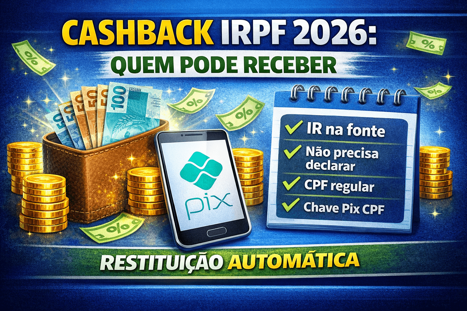 A principal novidade do IRPF 2026 é o chamado Cashback IRPF, um lote especial de restituição automática para pessoas que tiveram imposto retido na fonte, mas não eram obrigadas a declarar. Segundo o governo federal, a medida pode alcançar cerca de 4 milhões de pessoas, com restituição automática via Pix.