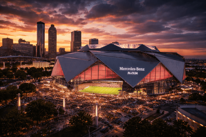 O Mercedes-Benz Stadium será o palco oficial da Copa do Mundo 2026 na cidade. Inaugurado em 2017, o estádio é conhecido pelo teto retrátil em formato de pétalas e pelo enorme telão circular interno.