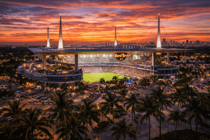 O Hard Rock Stadium, localizado em Miami Gardens, será o estádio oficial da Copa do Mundo 2026 na cidade. A arena tem capacidade para aproximadamente 65 mil torcedores e já recebeu Super Bowls, finais internacionais e grandes eventos esportivos.